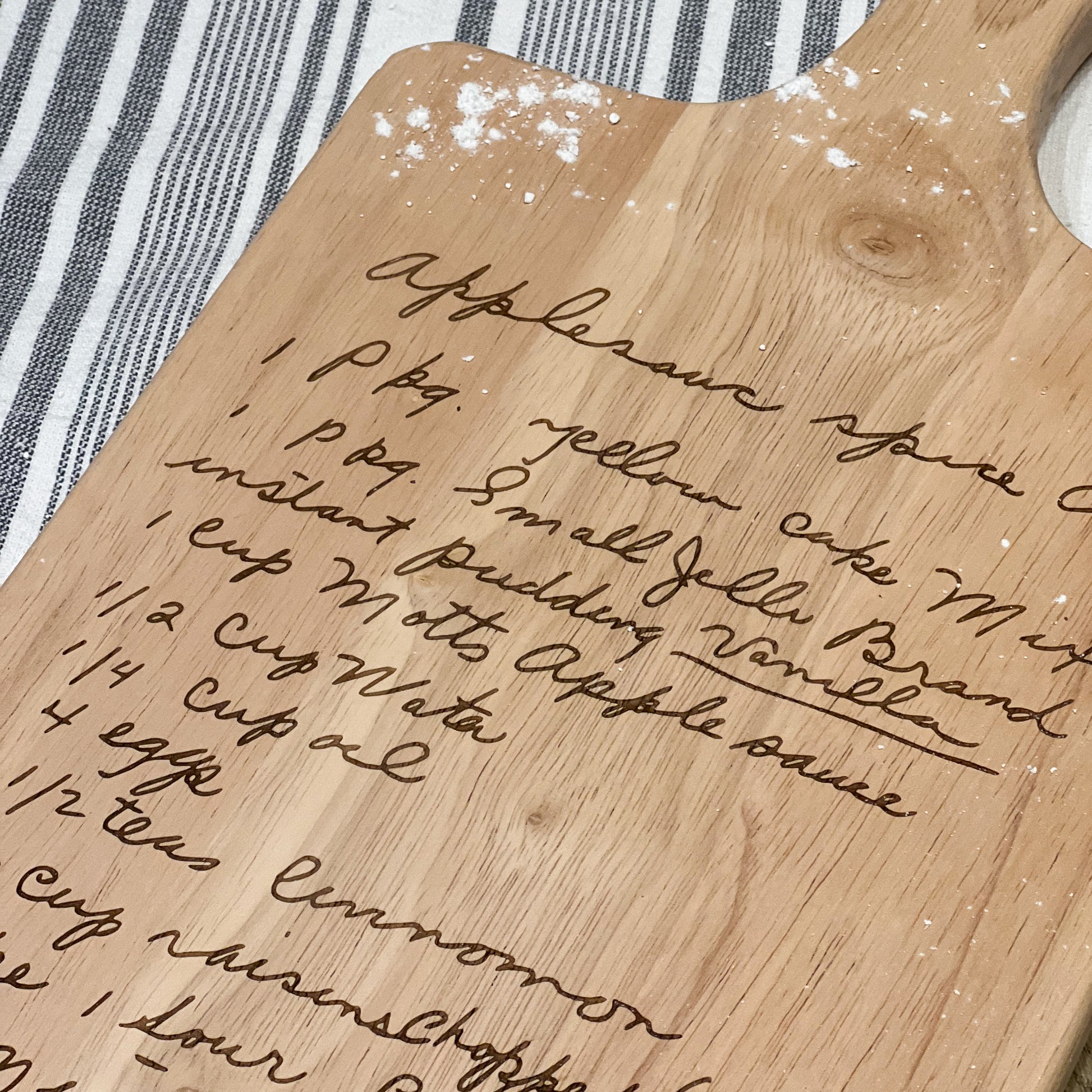 Crafted from high-quality wood, this beautiful cutting board transforms a cherished handwritten family recipe into a lasting heirloom.